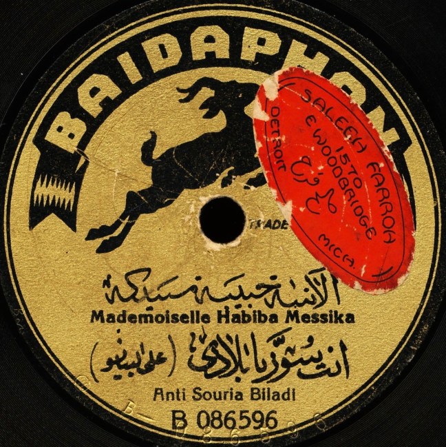 The perception that Messika’s Baidaphon discs were everywhere was not without merit. Messika’s records still turn up across the Middle East, in Tunisia and other parts of the Maghrib, and across the Americas. The copy in the Gharamophone archive, for example, was likely first purchased in interwar Syria before being carried in steamer truck to the United States by Syrian immigrant Saleeh Farroh. As he settled into the great Arab American hub of Detroit, Michigan, the turn-of-the-century born Farroh (or Farrah, as his name is spelled in the U.S. Census record of 1940) placed an address sticker on Messika’s record. By doing so, Farroh not only marked its provenance at the time but allowed for the tracking of its movement until the present. Sadly, decades after Farroh last played the record, Habiba Messika’s song for Syria still remains poignant.